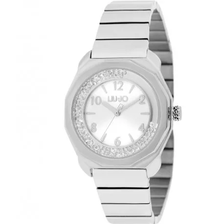 Montre-bracelet pour femme Liu Jo de la collection Dancing Twelve avec mouvement à quartz de calibre Myota. 2035 et fonction heure uniquement. Boîtier en acier inoxydable argenté d’un diamètre de 34 mm, lunette ornée de cristaux blancs lâches, cadran analogique argenté avec index bâtons mixtes et chiffres arabes, logo sur le dessus, verre minéral. Bracelet en acier inoxydable argenté avec boucle déployante à bouton-poussoir, résistant à l’eau 3 ATM : résistant aux éclaboussures mais pas sous pression.